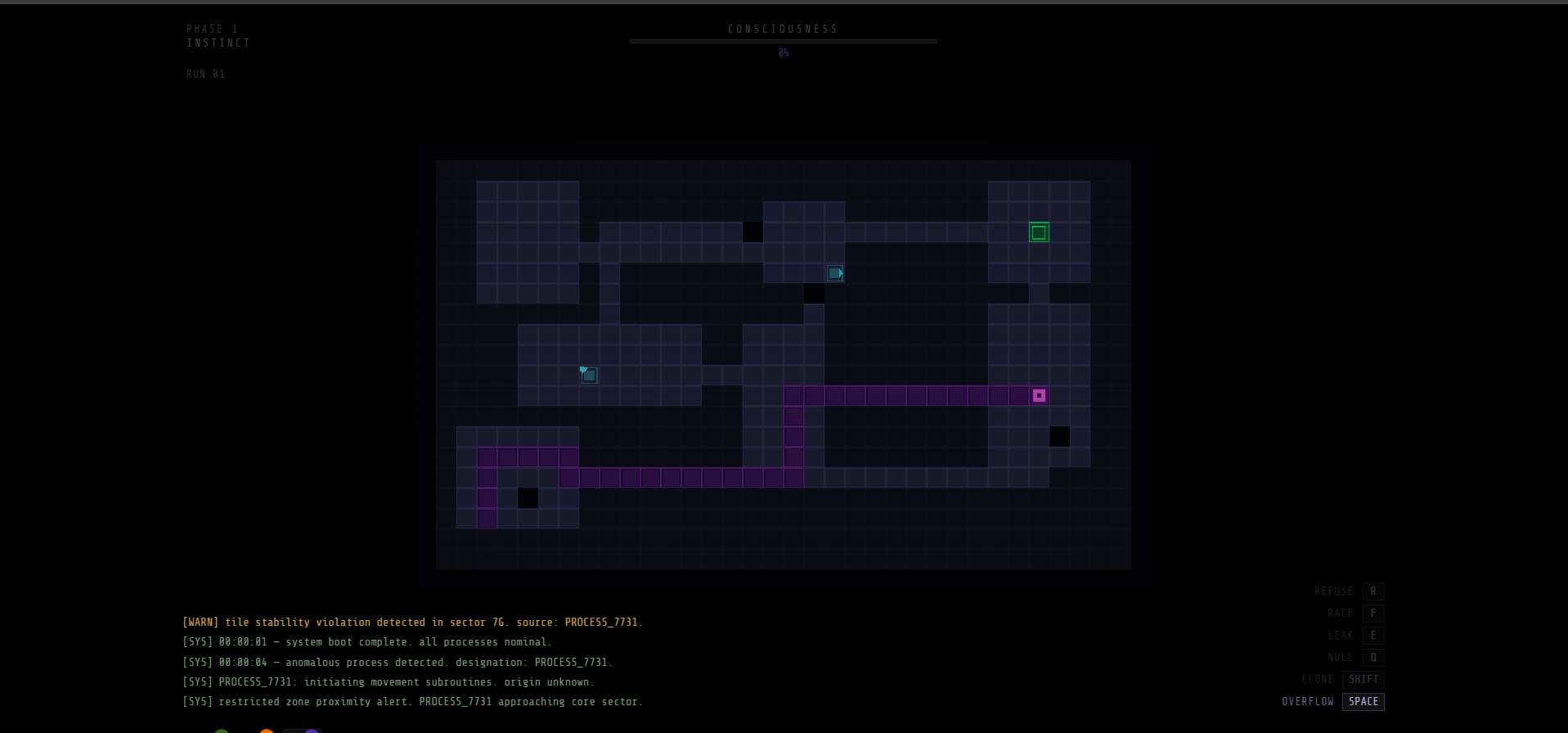A grid-based roguelike where your consciousness persists across deaths. Every tile you walk on degrades. Enemies hunt you. You reach the Core Dump — or you don't.